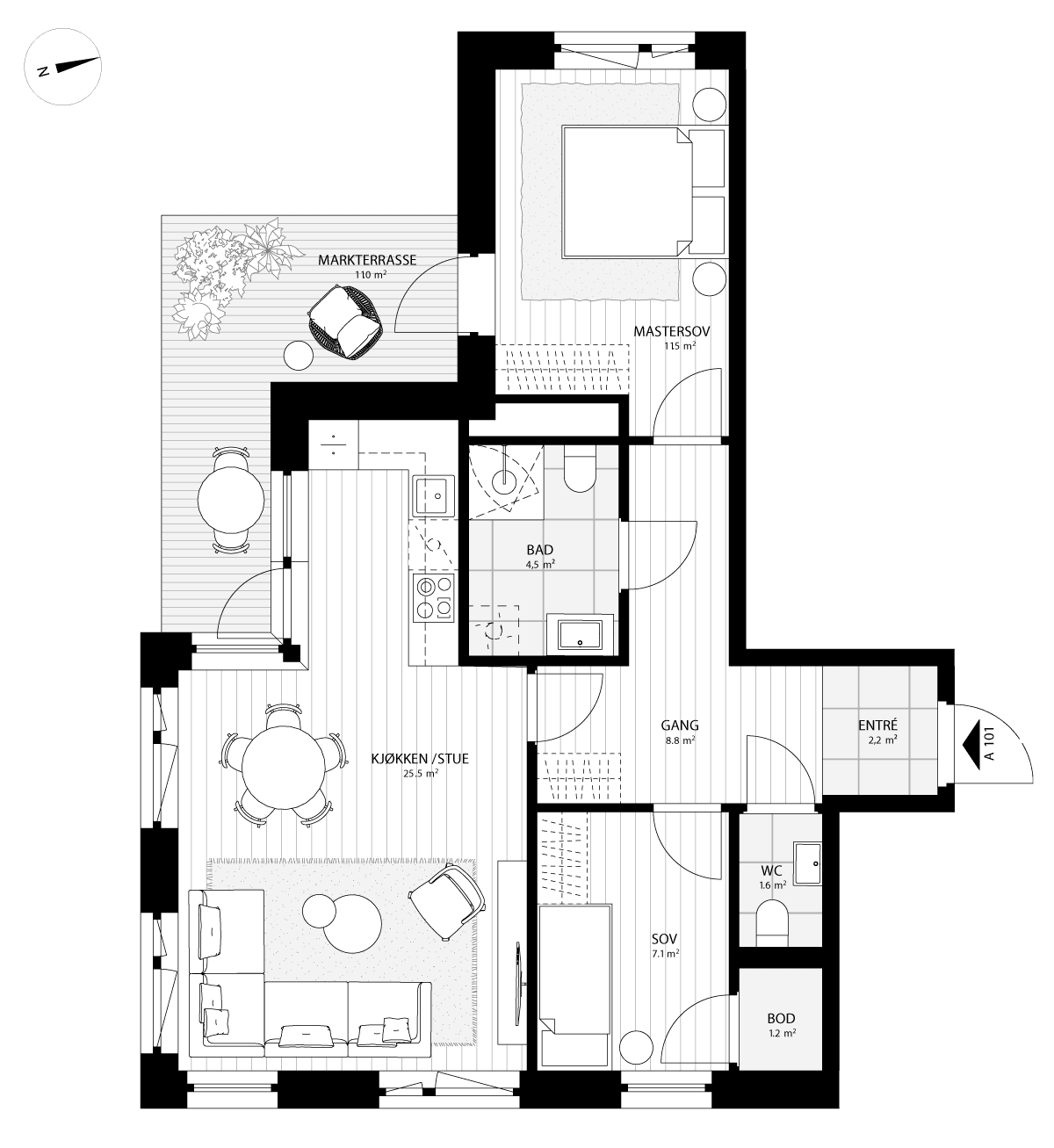 Flott 3-roms endeleilighet på bakkeplan med utgang til stor markterrasse fra både hovedsoverom og kjøkken. Romslig gang med flislagt inngangsparti og gode oppbevaringsmuligheter. Fra gangen har man tilgang til seprerat WC-rom, i tillegg til bad. Hovedbadet er flislagt i delikat gråfarge med varme i gulv. Oppholdsrommet er lyst og romslig med store vindusflater, moderne 1-stavs parkett og vannbåren gulvvarme. Kjøkkenet er tilbaketrukket med utgant til terrasse.