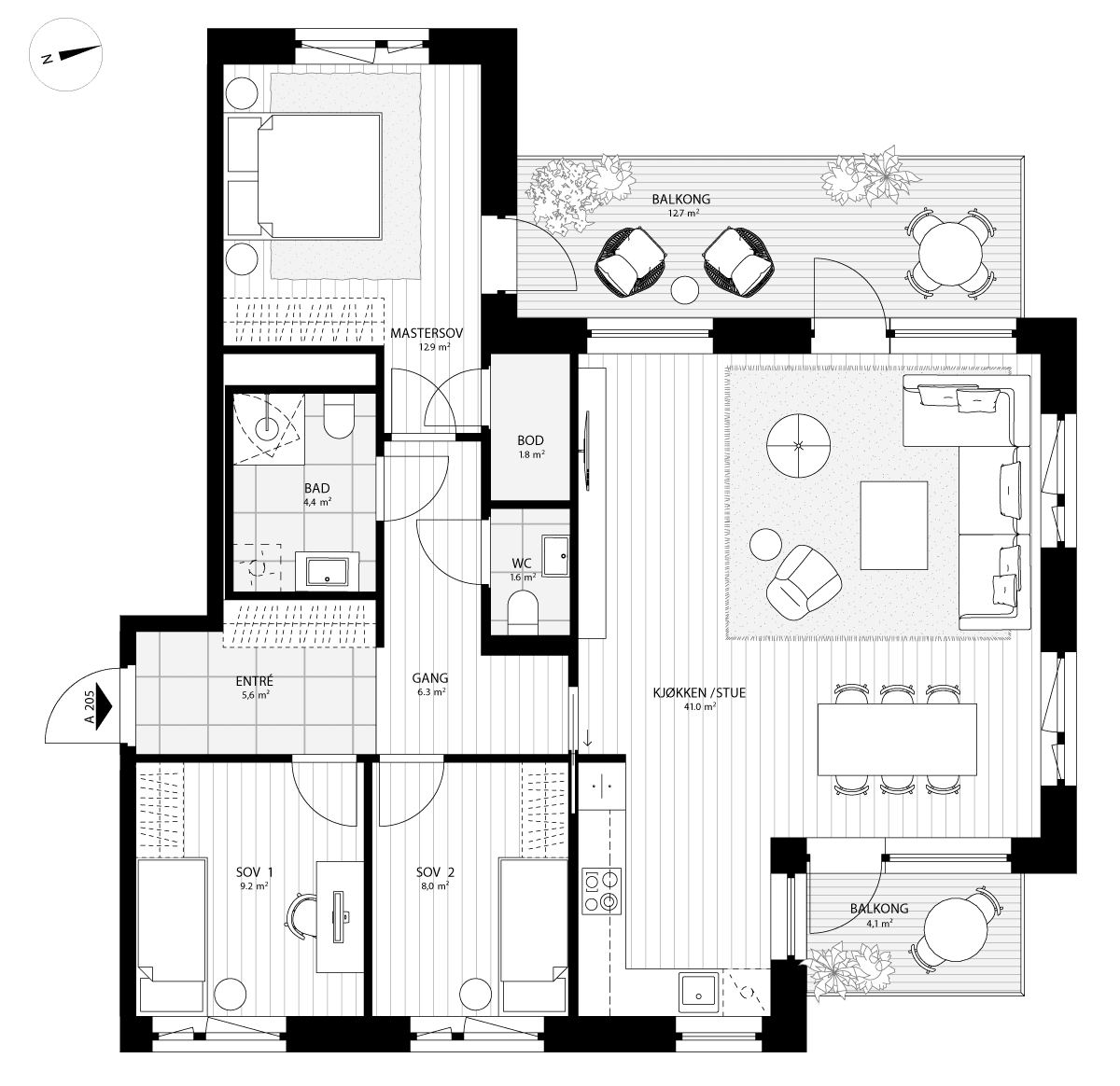 Innholdsrik 4-roms endeleilighet i høy andreetasje med utgang til vestvendt balkong fra både hovedsoverom og stue. Romslig gang med flislagt inngangsparti og gode oppbevaringsmuligheter. Fra gangen har man tilgang til seprerat WC-rom, i tillegg til bad. Hovedbadet er flislagt i delikat gråfarge med varme i gulv. Oppholdsrommet er lyst og romslig med store vindusflater fra to himmelretninger, moderne 1-stavs parkett og vannbåren gulvvarme. Kjøkkenet er tilbaketrukket med utgang til en mindre østvendt balkong.