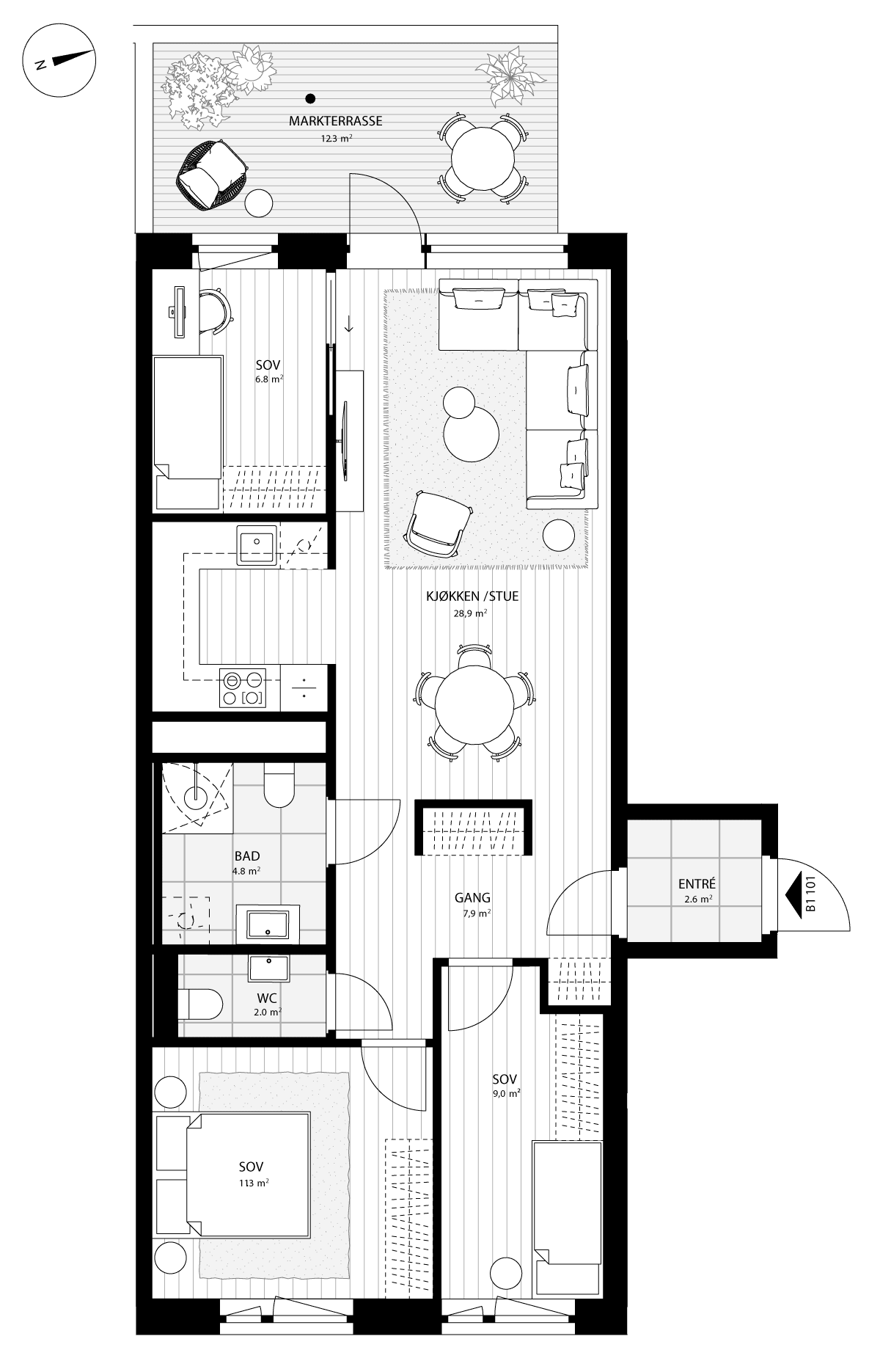 Gjennomgående 4-romsleilighet med vestvendt markterrasse. Flislagt inngangsparti med gode oppbevaringsmuligheter. Fra gangen har man tilgang til seprerat WC-rom, i tillegg til bad. Hovedbadet er flislagt i delikat gråfarge med varme i gulv. Oppholdsrommet er lyst og romslig med store vindusflater, moderne 1-stavs parkett og vannbåren gulvvarme. Kjøkkenet er fint tilbaketrukket fra stuen.