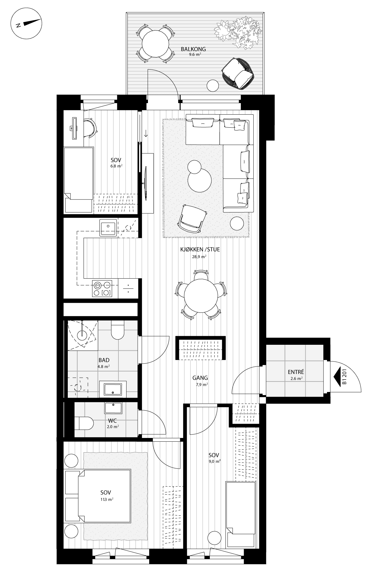 Gjennomgående 4-romsleilighet med vestvendt balkong. Seperat flislagt inngangsparti, samt gang med gode oppbevaringsmuligheter. Fra gangen har man tilgang til seprerat WC-rom, i tillegg til bad. Hovedbadet er flislagt i delikat gråfarge med varme i gulv. Oppholdsrommet er lyst og romslig med store vindusflater, moderne 1-stavs parkett og vannbåren gulvvarme. Kjøkkenet er fint tilbaketrukket fra stuen.
