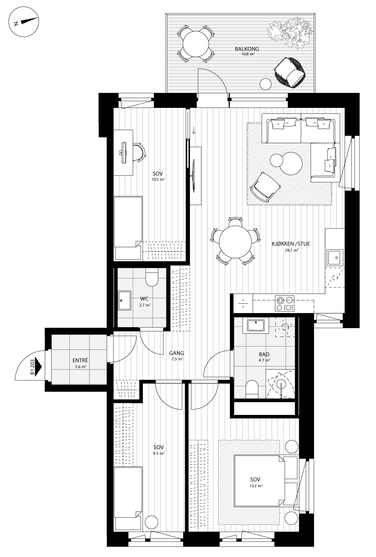 Gjennomgående 4-roms leilighet med vestvendt balkong. Flislagt inngangsparti med gode oppbevaringsmuligheter. Fra gangen har man tilgang til separat WC-rom, i tillegg til bad. Hovedbadet er flislagt i delikat gråfarge med varme i gulv. Oppholdsrommet er lyst og romslig med store vindusflater, moderne 1-stavs parkett og vannbåren gulvvarme. Kjøkkenet er fint tilbaketrukket fra stuen.