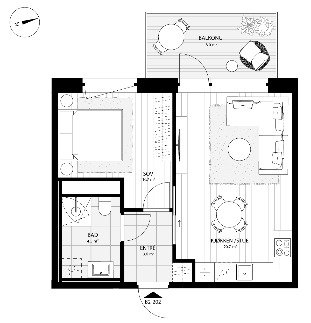 Arealeffektiv 2-romsleilighet med utgang til privat vestvendt balkong fra stuen. Flislagt seperat entre med oppbevaringsmuligheter. Badet er flislagt i delikat gråfarge med varme i gulv. Oppholdsrommet er lyst og romslig med store vindusflater, moderne 1-stavs parkett og vannbåren gulvvarme.