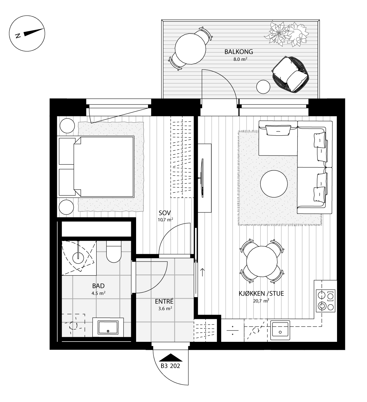 Arealeffektiv 2-romsleilighet med utgang til privat vestvendt balkong fra stuen. Flislagt seperat entre med oppbevaringsmuligheter. Badet er flislagt i delikat gråfarge med varme i gulv. Oppholdsrommet er lyst og romslig med store vindusflater, moderne 1-stavs parkett og vannbåren gulvvarme.