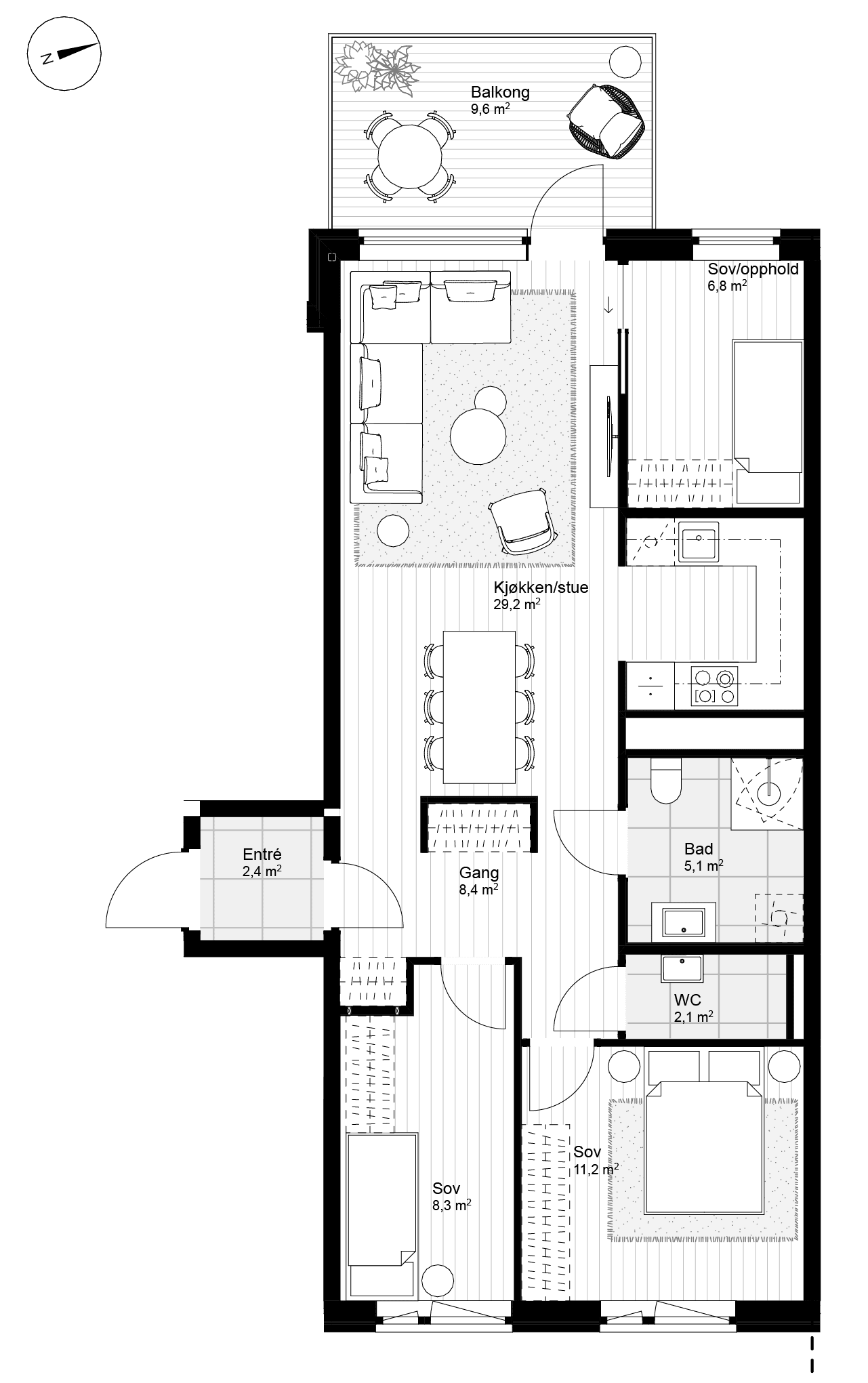 Gjennomgående 4-romsleilighet med vestvendt balkong. Flislagt inngangsparti med gode oppbevaringsmuligheter. Fra gangen har man tilgang til separat WC-rom, i tillegg til bad. Hovedbadet er flislagt i delikat gråfarge med varme i gulv. Oppholdsrommet er lyst og romslig med store vindusflater, moderne 1-stavs parkett og vannbåren gulvvarme. Kjøkkenet er fint tilbaketrukket fra stuen i en praktisk hesteskoløsning for mye benk og skapplass.