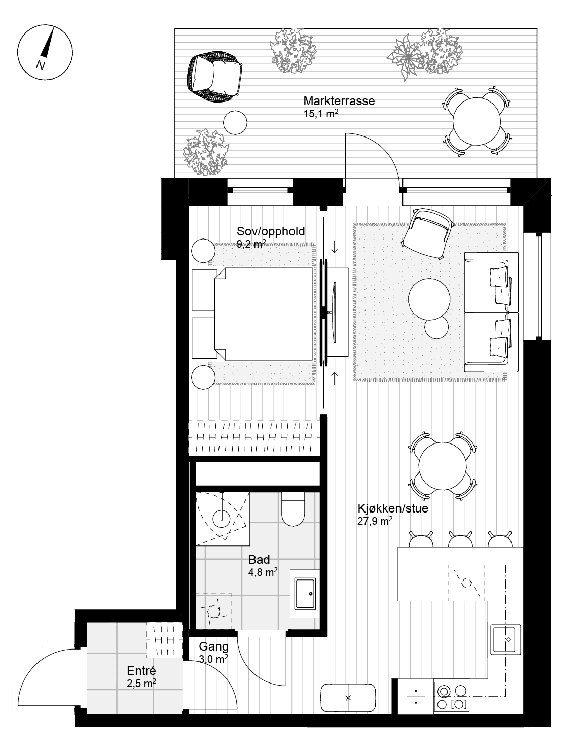 Stor og romslig 2-romshjørneleilighet med utgang til markterrasse fra stuen. Flislagt separat entre med oppbevaringsmuligheter. Badet er flislagt i delikat gråfarge med varme i gulv. Oppholdsrommet er lyst og romslig med store vindusflater, moderne 1-stavs parkett og vannbåren gulvvarme.
