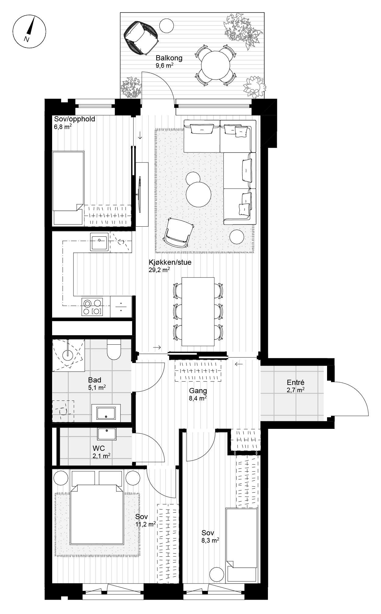 Gjennomgående og romslig 4-roms leilighet med privat balkong. Kjøkkenet er trukket litt tilbake fra stuen i en praktisk hesteskoløsning. Oppholdsrommet er lyst og romslig med store vindusflater, moderne 1-stavs parkett og vannbåren gulvvarme.