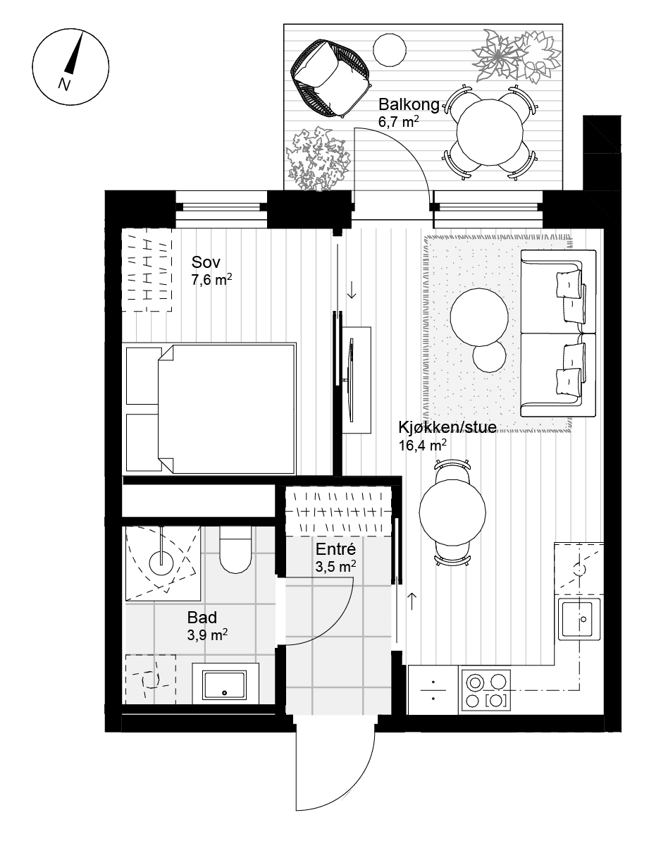 Arealeffektiv 2-romsleilighet med utgang til balkong fra stuen. Flislagt separat entre med oppbevaringsmuligheter. Badet er flislagt i delikat gråfarge med varme i gulv. Oppholdsrommet er lyst og romslig med store vindusflater, moderne 1-stavs parkett og vannbåren gulvvarme.