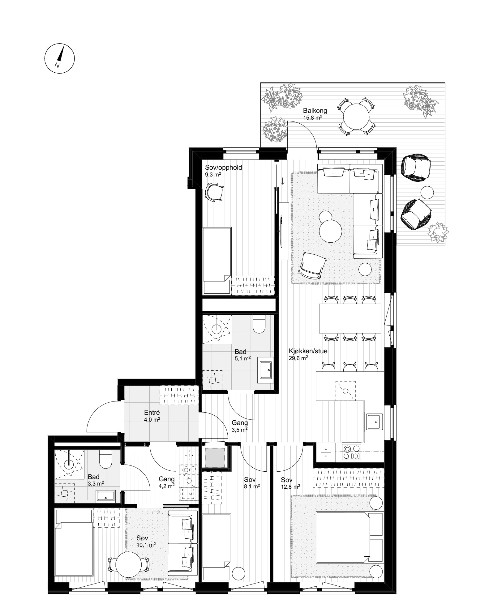 Stor og innholdsrik 5-roms hjørneleilighet med mulighet for hybelløsning. Kjøkkenet har godt med benkeplass med sosial løsning for sitteplasser langs ene siden. Oppholdsrommet får godt med lysinnslipp da den ligger på hjørnet med store vindusflater, og rommet får moderne 1-stavs parkett og vannbåren gulvvarme. Badene er flislagt i delikat gråfarge med varme i gulv. Separat entre med mulighet for oppbevaringsløsning.