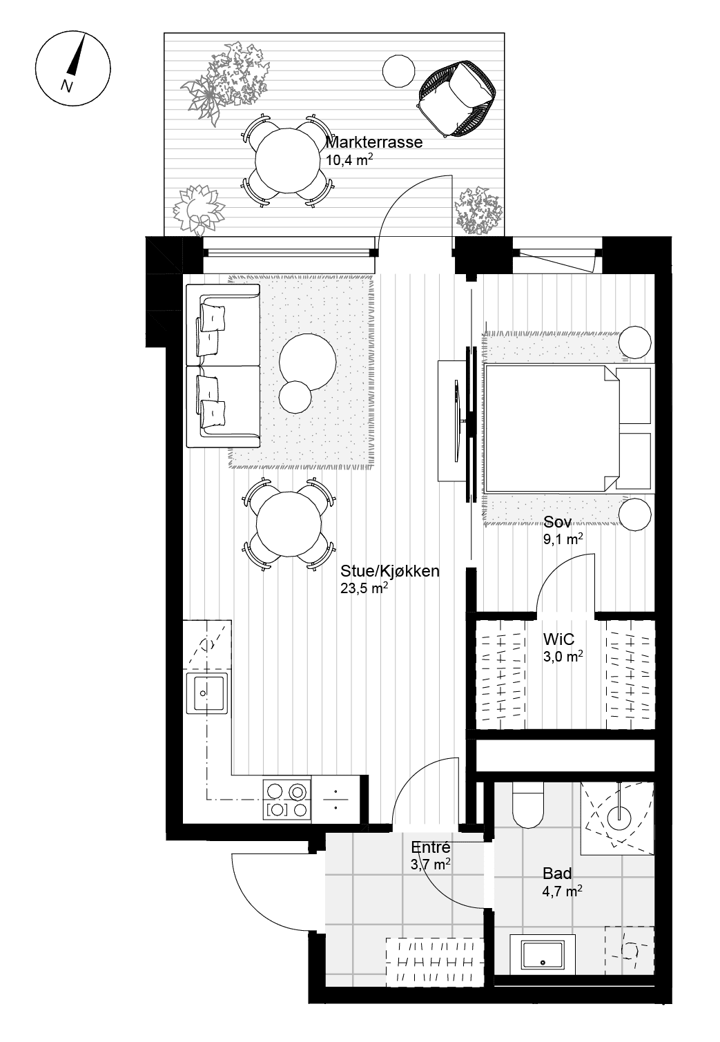 Stor og romslig 2-romsleilighet med utgang til markterrasse fra stuen. Flislagt separat entre med oppbevaringsmuligheter. Badet er flislagt i delikat gråfarge med varme i gulv. Oppholdsrommet er lyst og romslig med store vindusflater, moderne 1-stavs parkett og vannbåren gulvvarme.