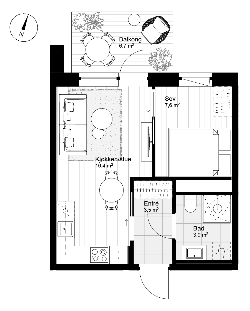 Arealeffektiv 2-romsleilighet med utgang til balkong fra stuen. Flislagt separat entre med oppbevaringsmuligheter. Badet er flislagt i delikat gråfarge med varme i gulv. Oppholdsrommet er lyst og romslig med store vindusflater, moderne 1-stavs parkett og vannbåren gulvvarme.