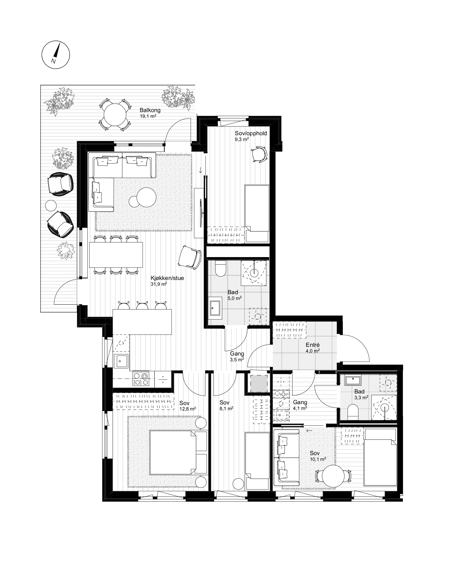 Stor og innholdsrik 5-roms hjørneleilighet med mulighet for hybelløsning. Kjøkkenet har godt med benkeplass med sosial løsning for sitteplasser langs ene siden. Oppholdsrommet får godt med lysinnslipp med hjørnebeliggenhet og store vindusflater, og rommet får moderne 1-stavs parkett og vannbåren gulvvarme. Badene er flislagt i delikat gråfarge med varme i gulv. Separat entre med mulighet for oppbevaringsløsning.