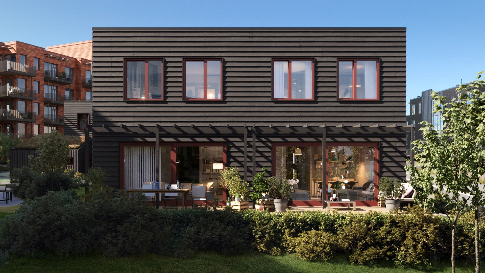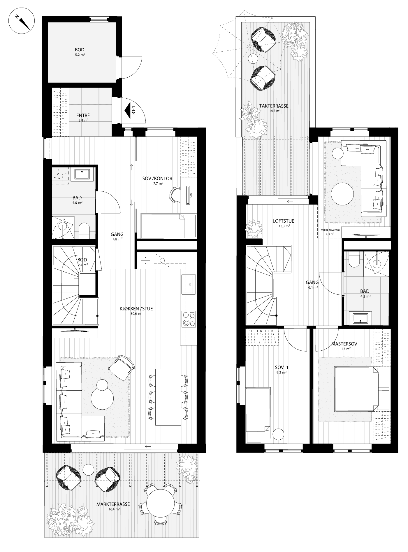 Flott enderekkehus over to plan med tre soverom, to bad og lofstue med direkte adgang til sørvendt takterrasse. Fleksibel planløsning som gir mulighet til et fjerde soverom. Uteareal på begge sider av huset sikrer sol store deler av dagen.