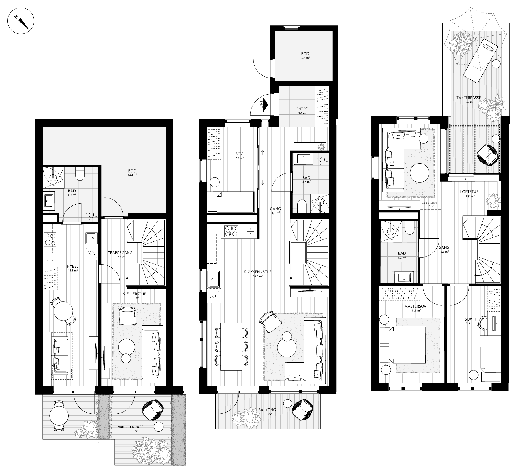 Stort enderekkehus med mulighet for hybel i sokkeletasje. Flott planløsning med tre soverom (mulighet for fire soverom), to bad og tre stuer. Boligen går over tre plan med direkte adgang til uteareal fra alle etasjene. Stor bod på hele 14,4 kvadratmeter i sokkel i tillegg til utvendig sportsbod ved inngangsparti.