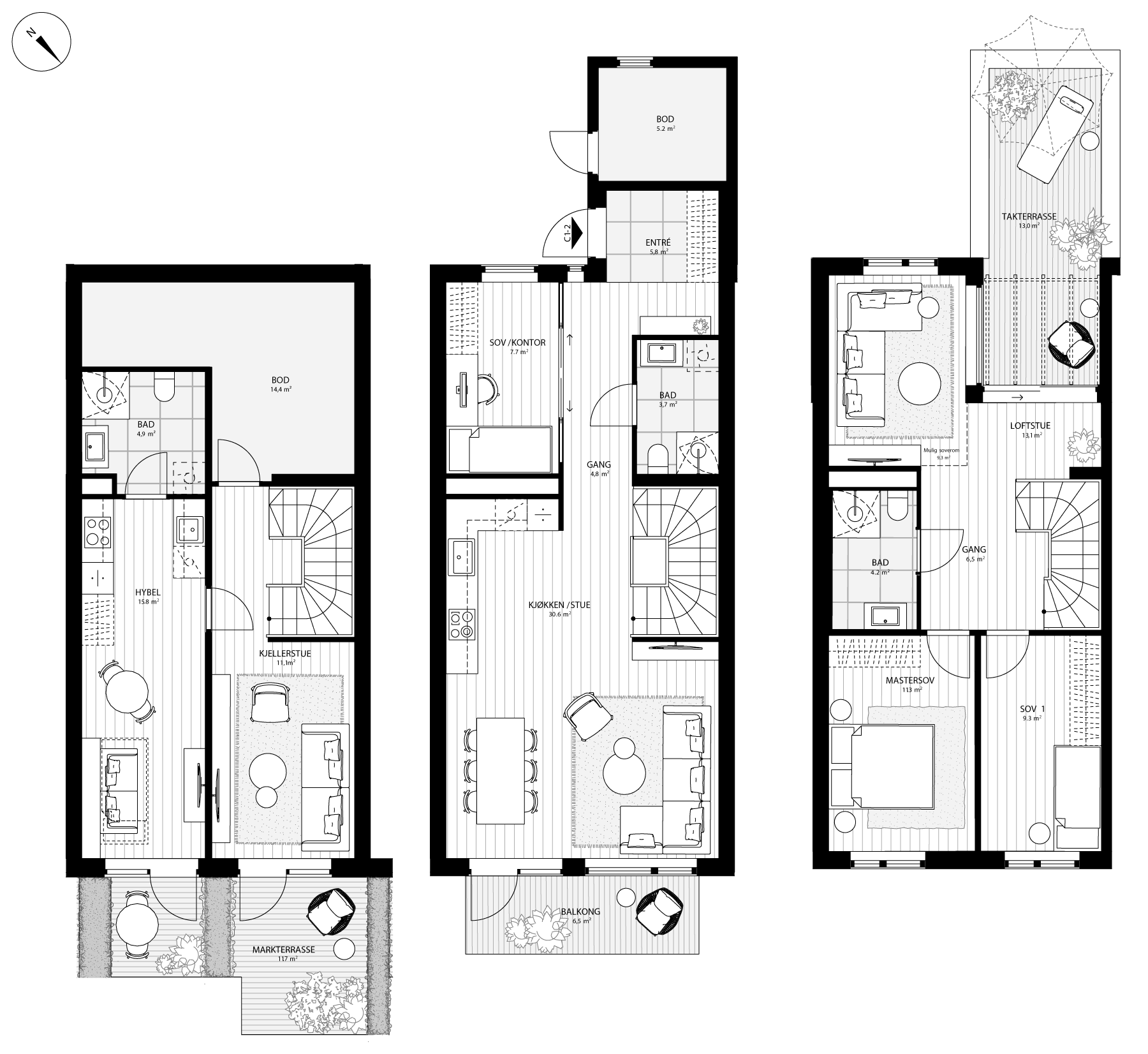 Stort rekkehus med mulighet for hybel i sokkeletasje. Flott planløsning med tre soverom (mulighet for fire soverom), to bad og tre stuer. Boligen går over tre plan med direkte adgang til uteareal fra alle etasjene. Stor bod på hele 14,4 kvadratmeter i sokkel i tillegg til utvendig sportsbod ved inngangsparti.
