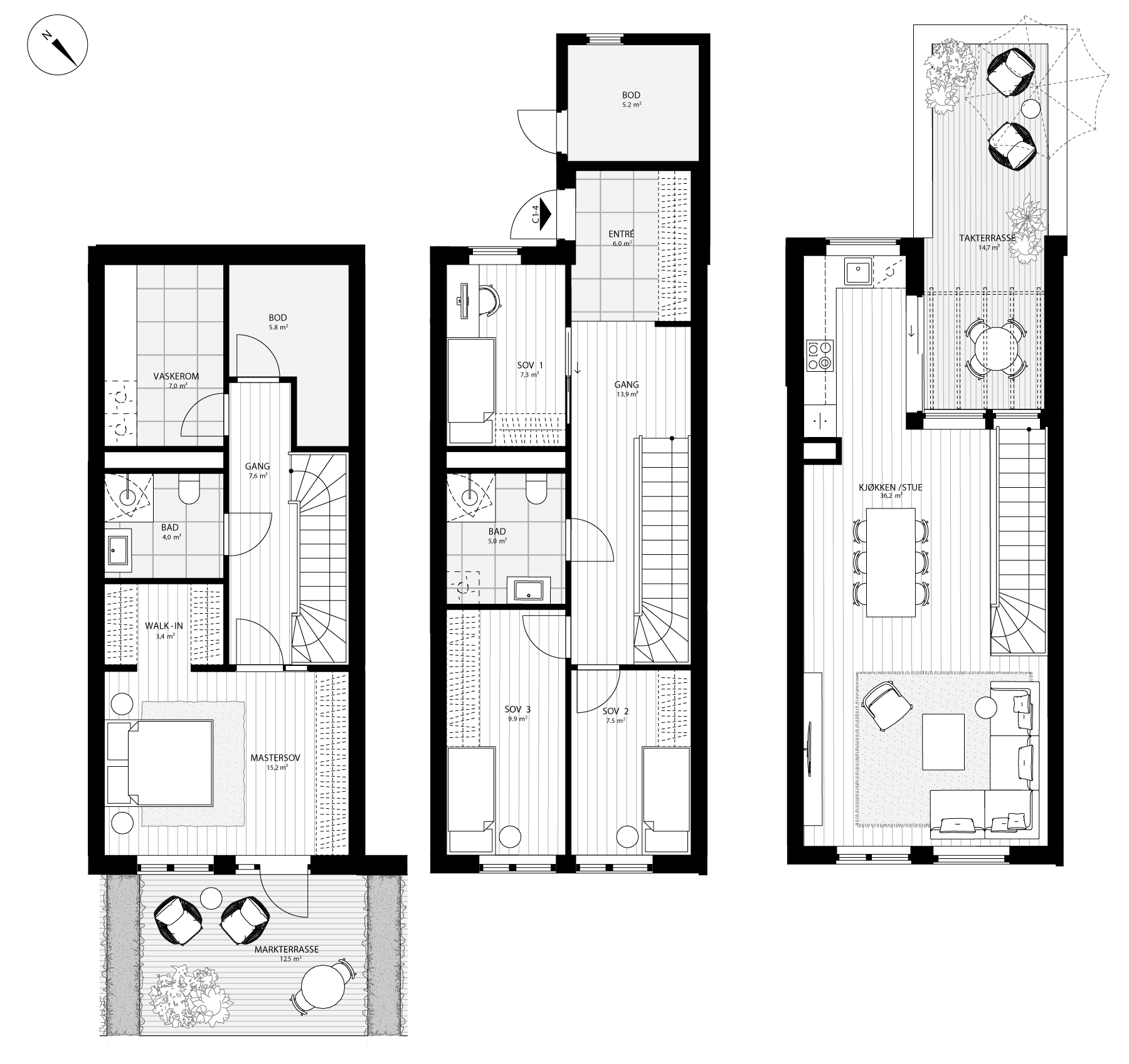 Innholdsrikt rekkehus med romslig markterrasse og sørvendt takterrasse. Fire soverom, hvorav hovedsoverommet er hele 15 kvadratmeter med god plass til garderobeløsning. I tillegg til bad både i sokkel og første etasje har man et praktisk vaskerom. God oppbevaringsplass i innvendig bod, samt i sportsbod ved inngangsparti.