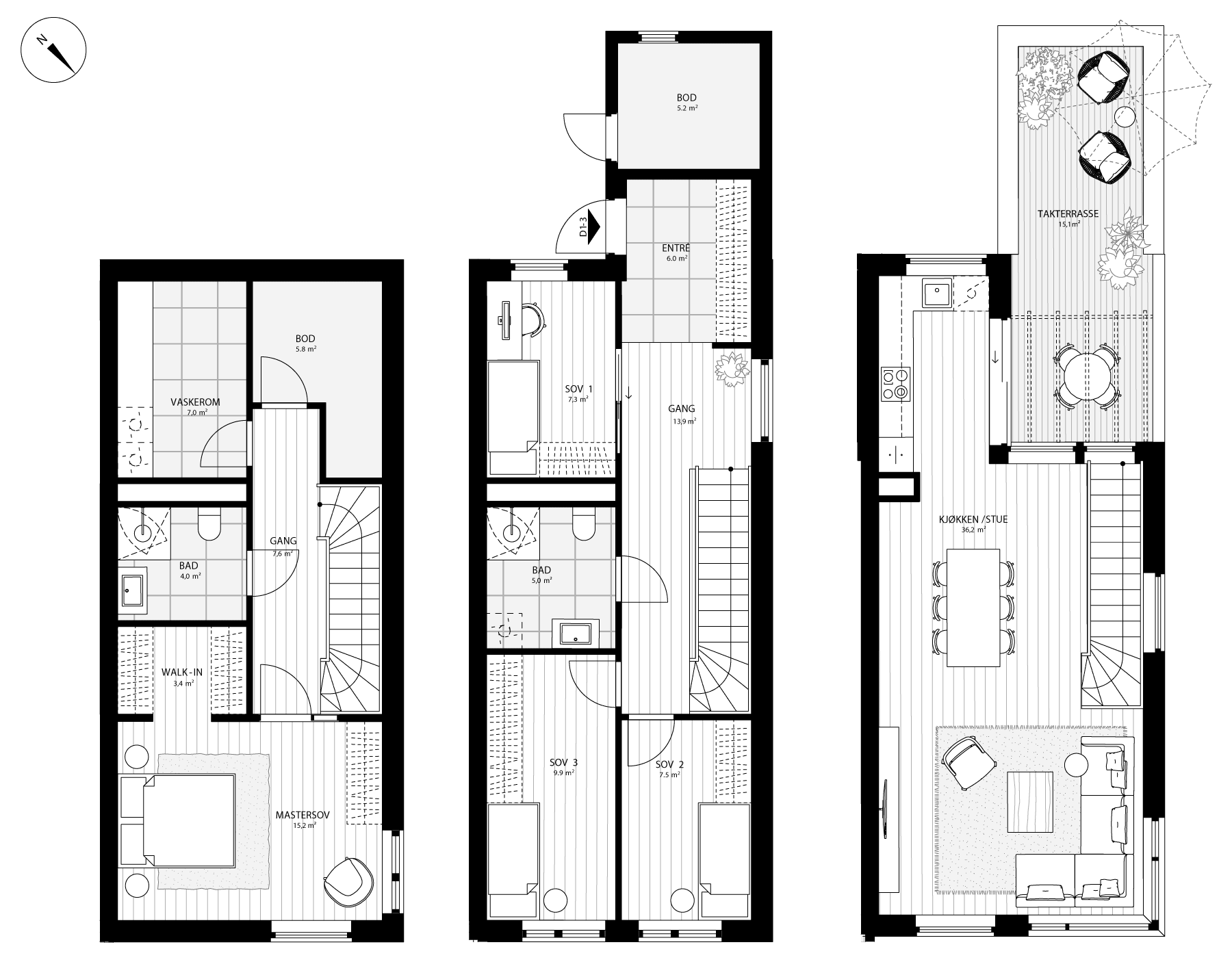Innholdsrikt enderekkehus med fjordutsikt og sørvendt takterrasse. Utformingen med saltak gir en flott fasade og fantastisk takhøyde i øverste etasje. Fire soverom, hvorav hovedsoverommet er hele 15 kvadratmeter med god plass til garderobeløsning. I tillegg til bad både i sokkel og første etasje har man et praktisk vaskerom. God oppbevaringsplass i innvendig bod, samt i sportsbod ved inngangsparti.
