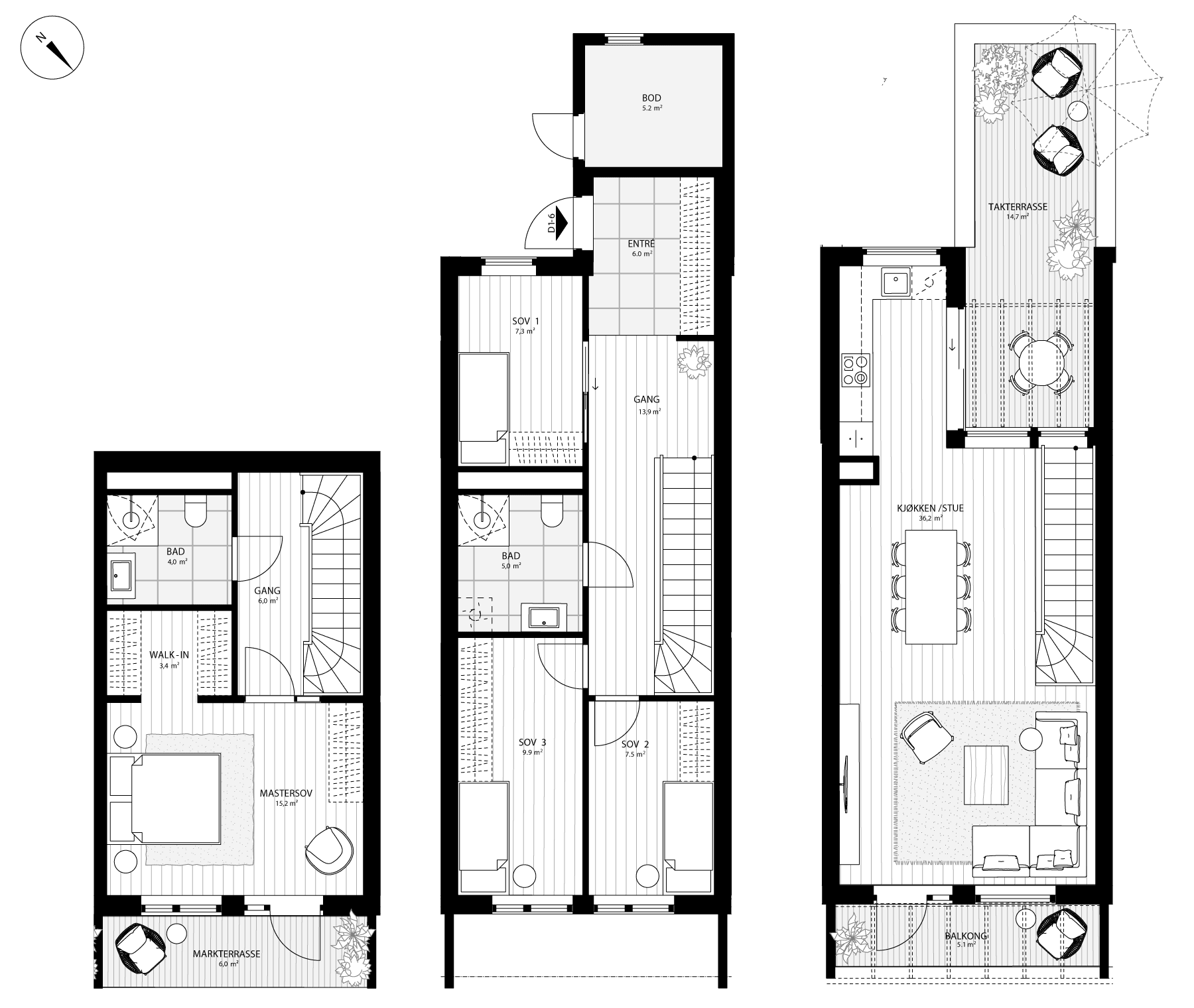 Flott rekkehus med hele tre uteplasser. Boligen har en åpen stue- og kjøkkenløsning i øverste etasje med uteplass på begge sider. Her vil man ha flotte sol- og utsiktsforhold. Boligen har fire soverom og to delikate bad. Sportsbod ved inngangsparti for oppbevaring.