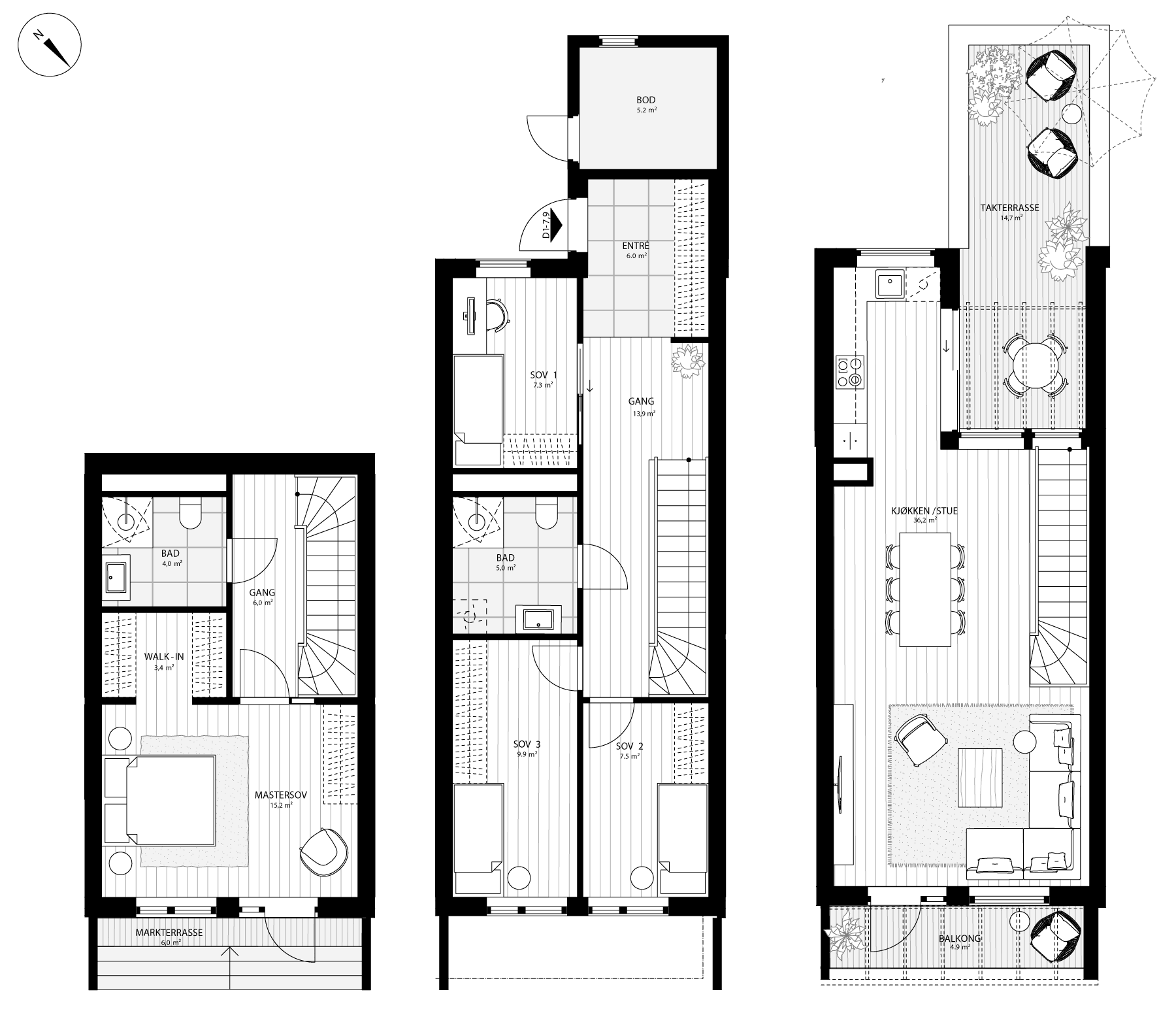 Flott rekkehus med hele tre uteplasser. Boligen har en åpen stue- og kjøkkenløsning i øverste etasje med uteplass på begge sider. Her vil man ha flotte sol- og utsiktsforhold. Boligen har fire soverom og to delikate bad. Sportsbod ved inngangsparti for oppbevaring.